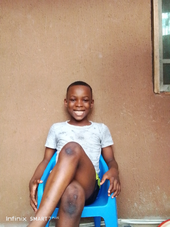 - "A young boy sits on a blue plastic chair, smiling broadly at the camera" by FM-Knnms1, licensed under CC BY 4.0