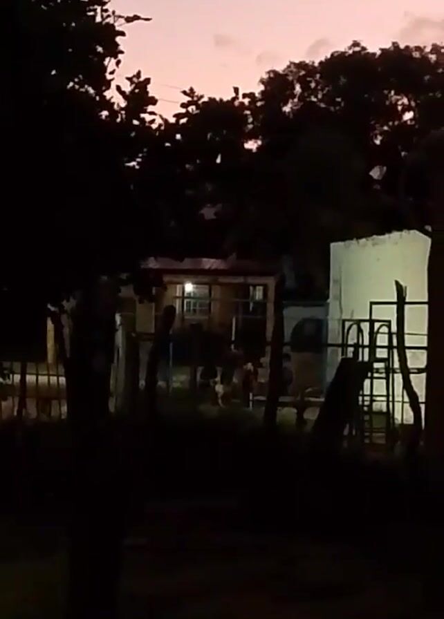 dimly lit scene at twilight. In the distance, a single-story house is visible through a wooden fence. A light is on inside the house. To the right of the house is a white wall with a structure resembling a climbing frame in front of it. Silhouettes of trees frame the top and left of the scene. The sky is a soft gradient of pink and purple. The bottom of the frame is mostly dark, suggesting a grassy area. The text "Infinix SMART 8" is displayed at the bottom of the screen.
