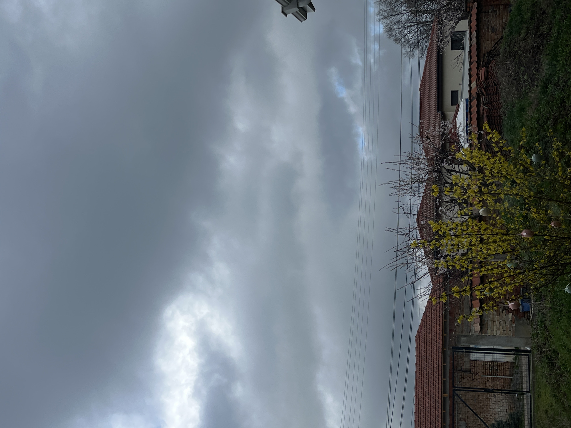 The image depicts a residential scene in Marten, Bulgaria, under a heavily overcast sky. The upper two-thirds of the frame are dominated by dense, grey cloud cover, with lighter patches suggesting varying cloud density or diffused light, and slight hints of blue sky visible through breaks. Multiple horizontal utility lines traverse the mid-upper section of the frame. Below the sky, the mid-ground features several houses with reddish-brown terracotta tile roofs. On the left, a property boundary includes a dark metal gate and a brick wall. A lighter-colored building with dark-framed windows is visible further back on the right. In the foreground, a vibrant yellow-flowering Forsythia shrub, adorned with several decorative, colored eggs (pink, light blue, green, white) hanging from its branches, occupies the center. Bare-branched trees and others with white blossoms are visible behind this shrub and between the houses. A low brick wall topped with a stack of red roof tiles is present in the mid-right. The immediate foreground consists of green grass and patches of dark earth. No individuals or animals are visible, and no specific actions or interactions are occurring. A grey, angular utility fixture is partially visible on the far right edge against the sky.