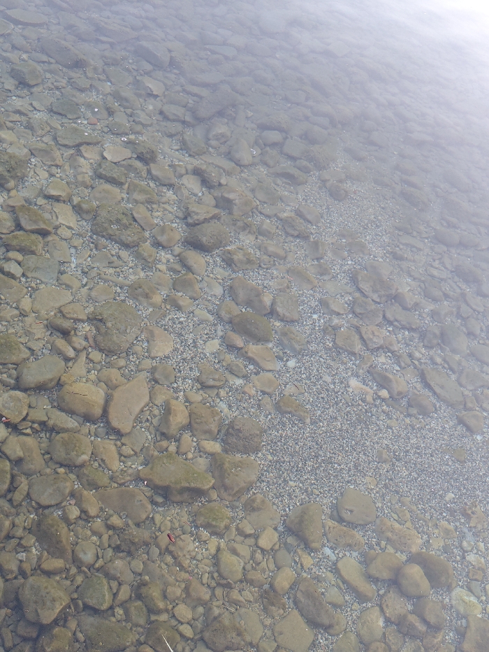 The image displays a clear, shallow section of Lake Ohrid, North Macedonia, viewed from an elevated perspective. The transparent water reveals the lakebed composed primarily of various irregularly shaped stones and coarse gravel. The stones, ranging in size from small to medium-large, exhibit shades of light brown and grey, with some featuring visible patches of greenish algae. These larger stones are intermingled with and partially rest upon areas of finer, lighter-colored pebbles and sand, particularly prominent in the mid-right portion of the frame. No individuals, man-made objects, or discernible actions are present within the scene.