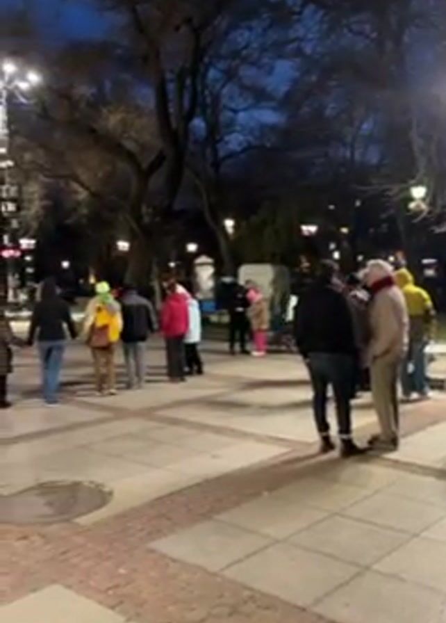 group of people on a paved plaza or town square in the early evening