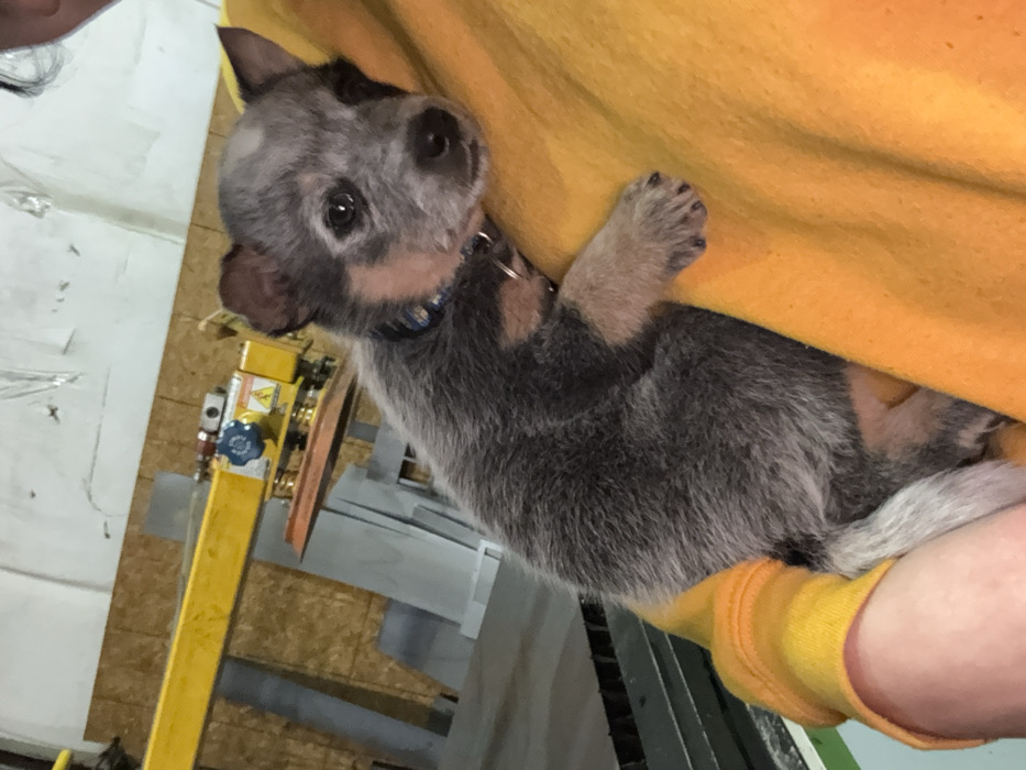 The scene depicts a blue heeler puppy being held by an individual within what appears to be an industrial or workshop environment