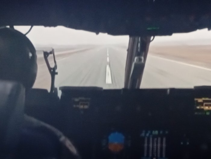 The image presents a forward view from an aircraft cockpit positioned on a runway