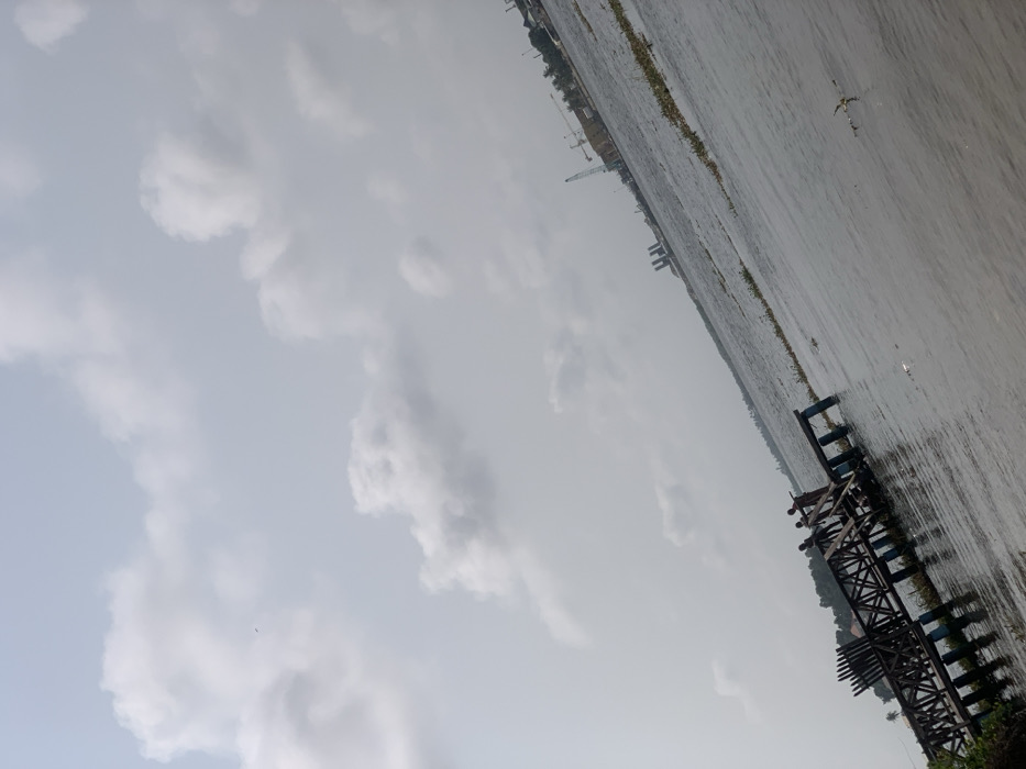 The image depicts a waterfront scene in Ibasa, Nigeria, captured with a slight rightward tilt. The upper two-thirds of the frame show an overcast sky populated by scattered white and light grey cumulus clouds. The lower third features a wide body of greyish-blue water with discernible ripples, hosting sparse aquatic vegetation and some floating debris. A dark-stained wooden pier or jetty, supported by visible posts (some painted light blue), extends from the left mid-ground into the water. Three human figures, indistinct in detail due to distance, are observed standing on the pier near its end. Along the distant right horizon, industrial structures are visible on a landmass, including multiple large construction cranes and several tall, dark vertical elements resembling smokestacks or silos. On the far left horizon, dense green foliage indicates shoreline vegetation.
