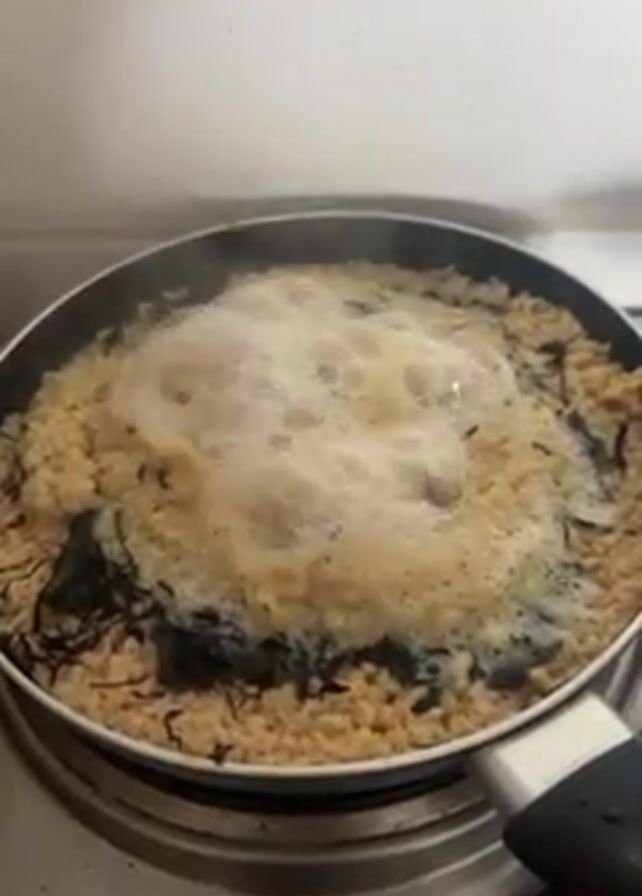 A close-up video shows a frying pan on a hot electric stove. The pan contains a bubbling, foamy liquid over rice and what appears to be seaweed. The mixture is simmering and steaming. The stove's brand is partially visible, reading "NDAI". The background includes a white tiled wall. The pan's handle is black.