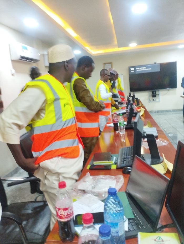 The image depicts a meeting room in Ashaka, Nigeria (latitude: 10.929, longitude: 11.476). The room is furnished with a long wooden table with chairs, and several laptop computers, water bottles and soda cans are placed on the table. The room has a white ceiling with yellow accent lighting, and the walls are painted white with a large black flat screen television mounted on the wall. There are six men in the room, all wearing yellow safety vests over various articles of clothing. Two of the men are sitting, while the others are standing, looking at the laptops and talking. The man in the foreground is wearing a white skullcap and has his back turned to the camera, while the other men are facing the camera. The room appears to be clean and well-maintained, with no other items present besides the furniture and office supplies.