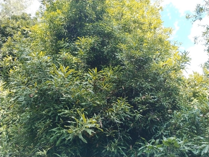 The scene depicts a dense aggregation of tree foliage in MUKURWE-INI, Kenya, under a daytime sky. The primary subject is a large volume of green leaves, varying in shade from dark green to lighter, yellowish-green where sunlight illuminates the canopy. The leaves exhibit a lobed or serrated appearance. The upper right portion of the frame shows a segment of light blue sky with scattered white clouds. No individuals, man-made objects, actions, or interactions are visible within the frame. The environment is exclusively natural.