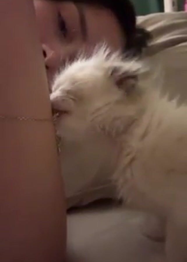 A woman is lying on a bed with a small, fluffy kitten nuzzling her arm. The woman has dark hair and is wearing a thin gold bracelet. The kitten is mostly white with some darker markings. They are both on a light-colored bed.