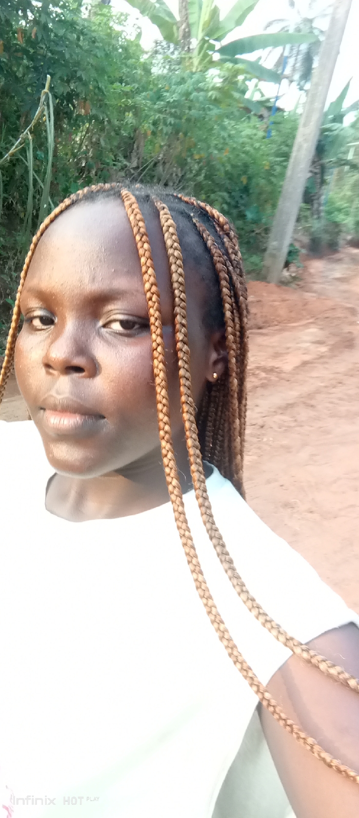 A young woman with braids poses outdoors. She wears a white t-shirt. The background features lush green vegetation and a dirt path. Her skin appears smooth and slightly shiny. She looks directly at the camera with a neutral expression. Her braids are a light brown or blonde color, contrasting with her darker hair and skin tone. A gold stud is visible in her ear. The lighting seems soft and natural, possibly during the early morning or late afternoon.