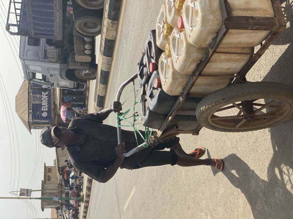 - "An adult male is observed pushing a two-wheeled cart laden with plastic jerrycans along a paved road under clear daylight" by FM-8PvpJ2, licensed under CC BY 4.0