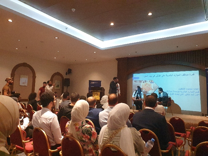 An indoor conference or seminar is depicted in a large room, located in Al-Mazza Municipality, Syria. The room features light-colored walls, dark wood trim along the upper sections, recessed ceiling lights, and two arched alcoves on the left wall. Approximately 30-40 individuals are visible, primarily seated in rows of red chairs with gold frames, oriented towards a raised stage area on the right. On the stage, a large projection screen displays Arabic text, including the title "قدرة موظف الموارد البشرية على التفكير في بيئة العمل" (The ability of Human Resources employees to think in the work environment) and credits, notably "إعداد: محمود الشلفون" (Prepared by: Mahmoud Al-Shalfoun). Two individuals are seated on the stage: a woman in a black and white patterned top and a man in a dark suit, functioning as panelists or speakers. A third man in a dark suit stands near them, facing the audience or interacting with the seated speakers. To the left on the stage, another man in a light-colored shirt stands, actively gesturing with his hands. A dark blue banner with a white logo and text is positioned to the left of the screen, alongside a golden stand. The audience comprises a mix of men and women, some wearing headscarves, mostly attentive to the stage. In the foreground, a person holds a plastic water bottle. On the left side of the room, several men are standing and interacting amongst themselves, with one man in a brown t-shirt observing the stage and another with a beard in a white shirt gesturing during conversation. A black speaker cabinet is visible on the left side of the stage.