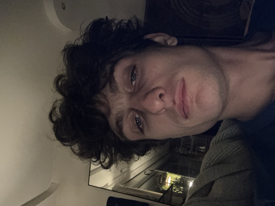 The image depicts a close-up portrait of a male individual, appearing to be a young adult, with a direct gaze towards the camera. He has dark, curly hair and blue eyes. His face is fair-skinned, and his expression is neutral. A dark-colored garment is visible on his torso, and a light green or grey ribbed knit fabric is draped over his left shoulder. The background is dimly lit and out of focus. To the left of the subject, a tall, rectangular mirror reflects a portion of an interior space. Within the mirror's reflection, a suspended light fixture with a drum-shaped, possibly woven shade is visible, along with green foliage from a plant beneath it. A light-colored ceiling with a curved architectural detail is also reflected. The scene is located indoors in the city of Vincennes, France, suggesting a residential or private setting during low-light conditions.