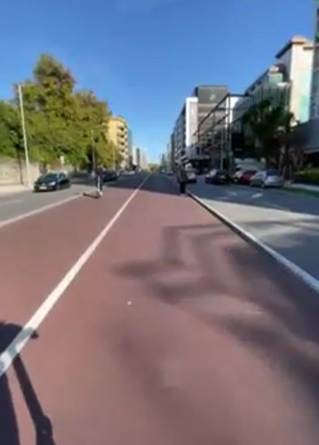 first-person perspective of someone riding a green electric scooter down a red-colored bike lane on a city street. There is a white line dividing the bike lane from the road. Cars are parked and moving on the right side of the road. Buildings line both sides of the street, and trees are visible along the sidewalks. People are standing and walking on the sidewalks and in the bike lane. The sky is clear and blue.
