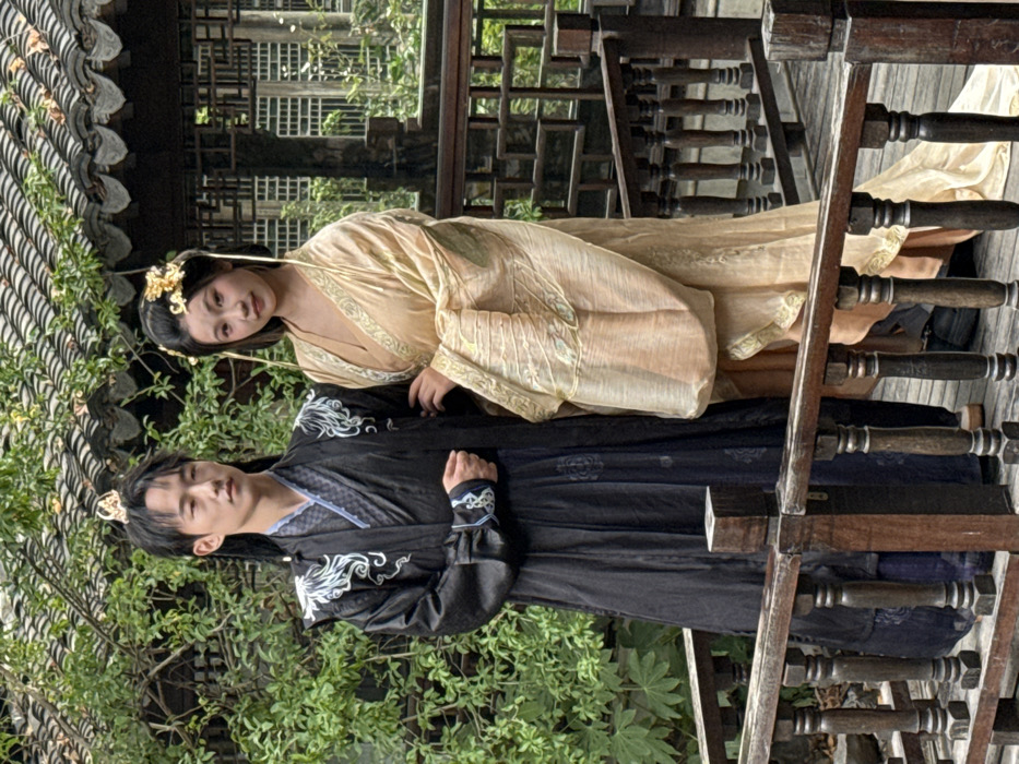 Two individuals are depicted posing on a weathered wooden deck with a carved balustrade in Qinhuai District, China