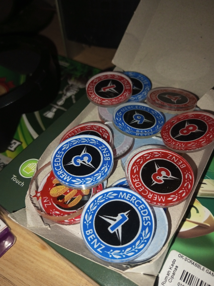 A collection of "Mercedes Benz" tokens in a cardboard box. The tokens are round and feature a black Mercedes Benz logo within a colored rim, either red or blue. Some tokens also display numbers. The box sits on a green surface alongside other game components, including a "Touch" label and a label reading "OK-SCRABBLE GAME." The tokens are mostly stacked and scattered inside the box, some overlapping each other.