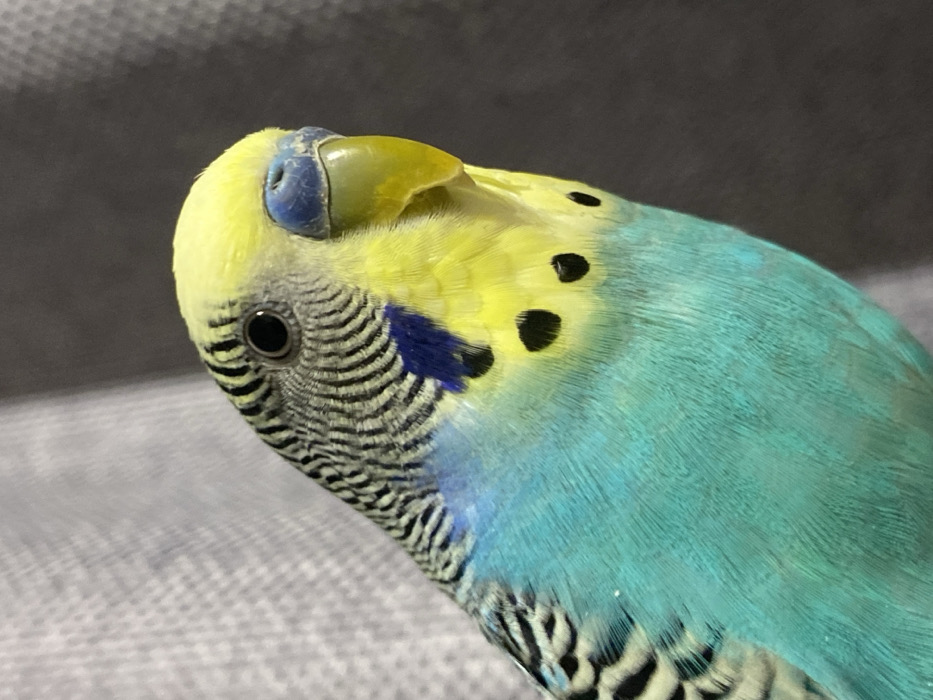 A close-up shows a budgerigar's head and upper body tilted upwards. The bird has a yellow face and head, transitioning to blue-green feathers on its body. Black stripes mark its throat and around its eye. The cere is blue, with a yellow beak. A few small black spots accent the yellow part of the head. The background is a blurry gray texture.