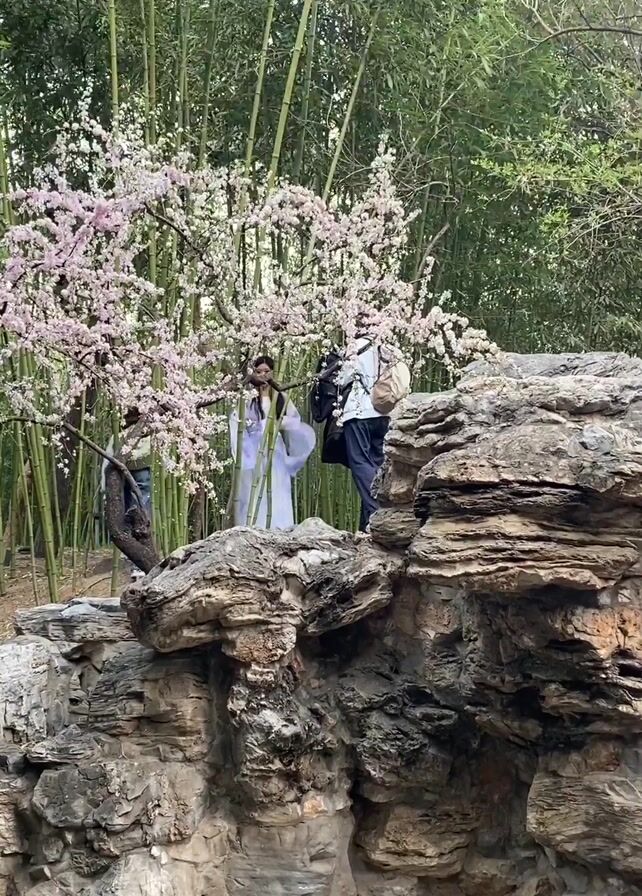 In a wide shot, a woman in a white traditional dress poses for a photographer amidst a grove of bamboo and a blossoming tree. The woman stands on a rocky outcrop near the tree, while the photographer, dressed in blue jeans and a white shirt, adjusts his camera to capture the shot. A third person is partially visible, also standing on the rocks. The ground in front of the rocks is paved with irregularly shaped gray stones. The scene exudes a serene atmosphere, likely capturing a staged photoshoot in a tranquil garden setting.