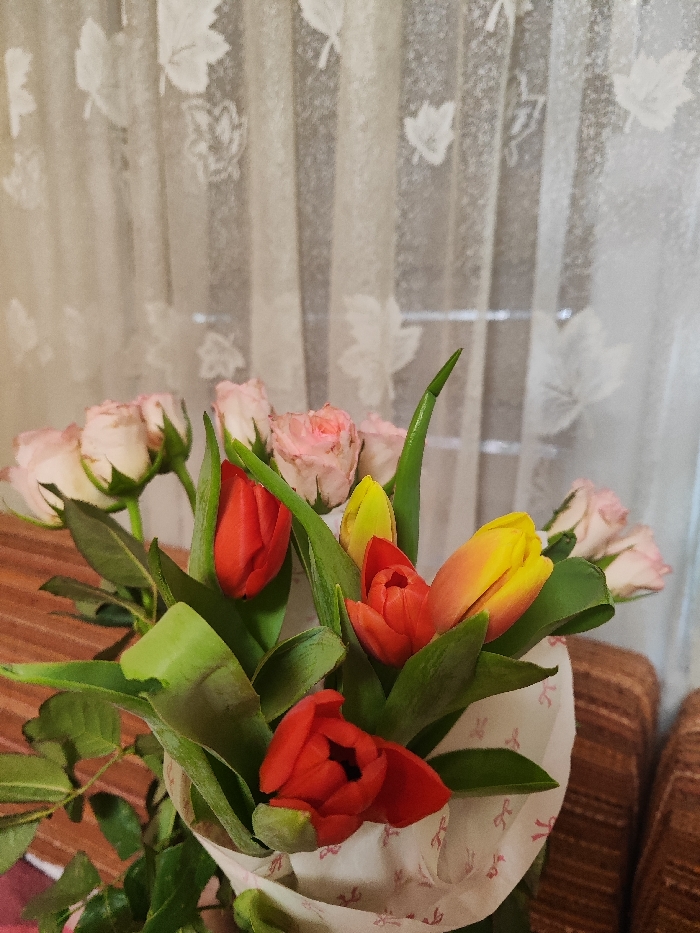 An indoor scene in Sliven, Bulgaria, displays a bouquet of flowers arranged on a surface. The primary subject is a cluster of tulips, comprising at least three red, one yellow, and one orange-to-yellow bi-colored bloom, all with prominent green stems and leaves, partially wrapped in white paper adorned with faint red bow patterns. Behind and to the left of the tulips, a group of light pink or cream-colored roses with tight buds is visible, slightly out of focus. The flowers rest on a brown, possibly wooden, slatted surface visible in the lower left and extending rightwards. To the right of the bouquet, a segment of a textured brown object, likely upholstery, is present. The background features a sheer, light-colored curtain with a repeating white leaf pattern, behind which faint vertical and horizontal lines suggest a window frame.