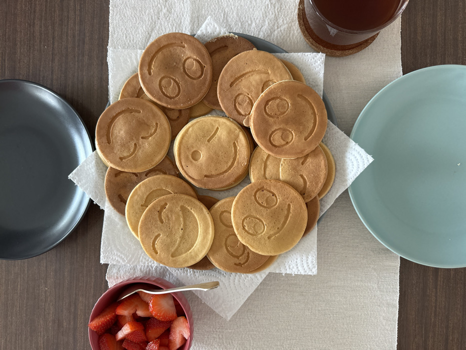 A top-down shot reveals a wooden table setting. A pile of smiley-face pancakes rests on a square of paper towels. A grey plate sits to the left, with a light blue plate on the right. A glass of dark liquid is positioned near the right edge, atop a coaster on the beige table runner. A small pink bowl filled with diced strawberries and a silver spoon is near the bottom left.