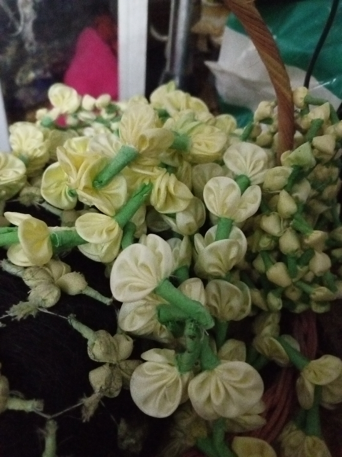 A close-up image displays a dense cluster of numerous small, artificial flowers, primarily in shades of light yellow. Each flower consists of a ruffled fabric blossom attached to a short, green, cylindrical stem. Many of these flowers are loosely grouped, and some appear to be resting on a dark, indistinct surface or fabric in the lower left portion of the frame. Towards the upper right, a section of a brown, woven basket handle is visible, suggesting the flowers are contained within or near a basket. The background is out of focus, revealing blurred shapes including a bright pink object, a vertical white structure, and other indistinct dark and green elements, indicative of an indoor setting. The scene is located in Phakeo, Laos.
