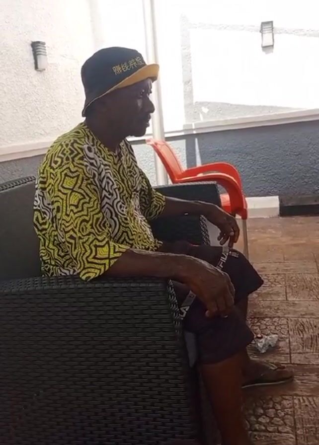 An elderly man sits in a black wicker chair outdoors, under a covered patio. He is wearing a patterned yellow and white shirt, dark shorts, and a black bucket hat with a yellow brim. The man is wearing brown flip-flops. His hands are resting on his lap. Behind him is a red plastic chair. The walls are white with light fixtures. The patio floor is tiled.