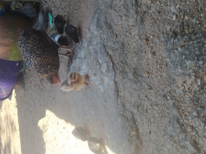 An adult hen with speckled brown and black plumage and red facial features is positioned towards the right side of the frame, bending its head towards the ground. Surrounding the hen are six chicks. One light brown chick stands prominently in the foreground, facing right. Two dark chicks are partially visible in the lower left. Three additional dark-colored chicks are clustered near the hen's feet on the right. The ground consists of uneven dirt mixed with gravel and interspersed with flat, light gray rocky patches. In the upper right background, a purple plastic container, a dark weathered pot, and various unidentifiable debris, including a blue plastic bottle, are visible. Strong shadows indicate direct sunlight. The scene takes place outdoors in the city of Unknown, Unknown.