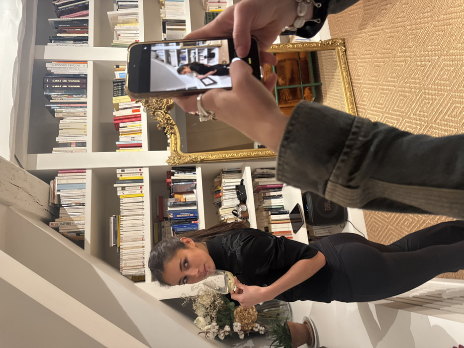A woman in black leans toward a glass and flowers, while a person in a denim jacket holds up a phone to photograph a mirror reflecting the same scene. Behind them are floor-to-ceiling bookshelves filled with books. A patterned rug and gold-framed mirror add to the interior's ambiance. A speaker and other electronics are also visible on the shelf behind the woman.