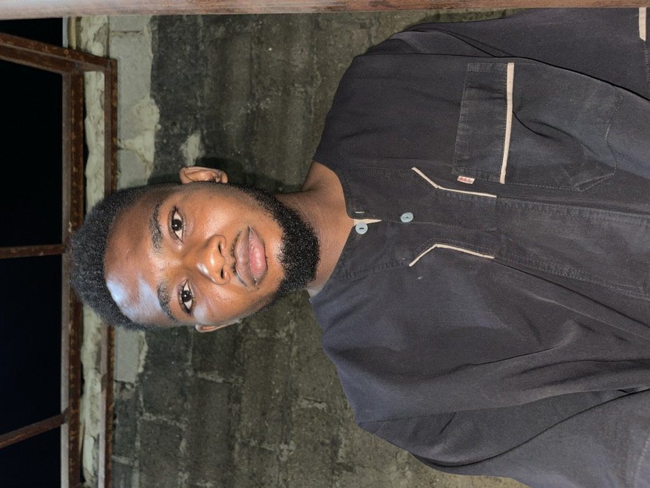 A young man with dark hair and a beard gazes towards the camera. He wears a dark-colored shirt featuring light-colored trim. The backdrop is a textured gray wall alongside a metallic railing. The lighting accentuates the details of his face and the texture of the wall.