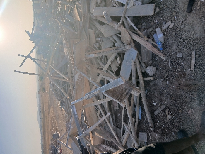pile of construction debris, including wooden planks, beams, and other materials. Some pieces are assembled into frames, perhaps remnants of a building. The debris sits on a patch of dirt and gravel. In the background, a dry, desolate landscape extends towards the horizon. A water bottle is partially visible amidst the rubble. The lighting suggests it is a bright, sunny day.