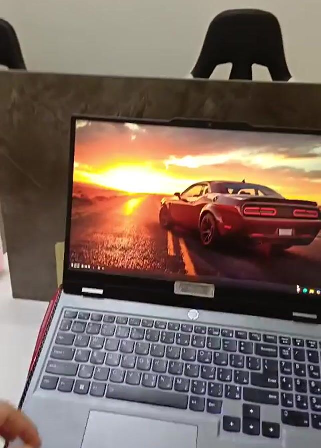 A person is showing off their laptop and RGB keyboard. The laptop is silver and has a picture of a car on its screen. The keyboard is black and has RGB lights behind the keys. The laptop sits on a red cooling pad. There is a box of tissues to the left. The camera is held up to the laptop and then moved down to show the keyboard.