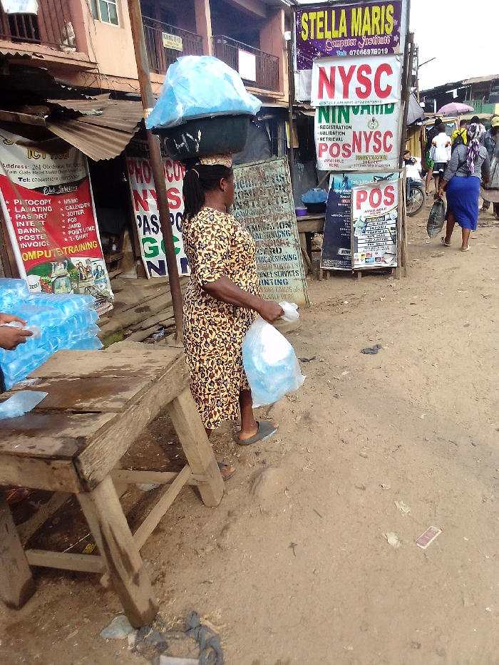 A woman balances a large load on her head while carrying a bag of water in her hand, walking on a dirt road. Various business signs are visible, including "Stella Maris Computer Institute," "NYSC," "Photocopy Laminating," and "POS." The environment is bustling with activity, as people can be seen in the background, along with motorbikes. A wooden table with water bags sits to the left, suggesting a commercial area where items are sold.