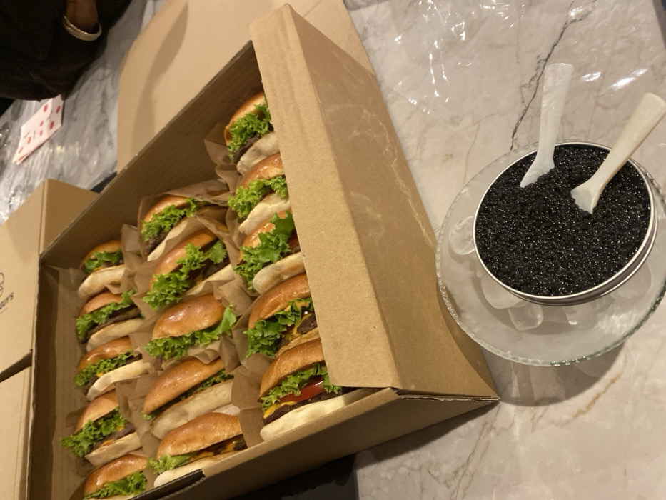 - "A cardboard box filled with numerous small burgers sits alongside a glass bowl filled with black caviar on top of ice" by FM-HRJI12, licensed under CC BY 4.0