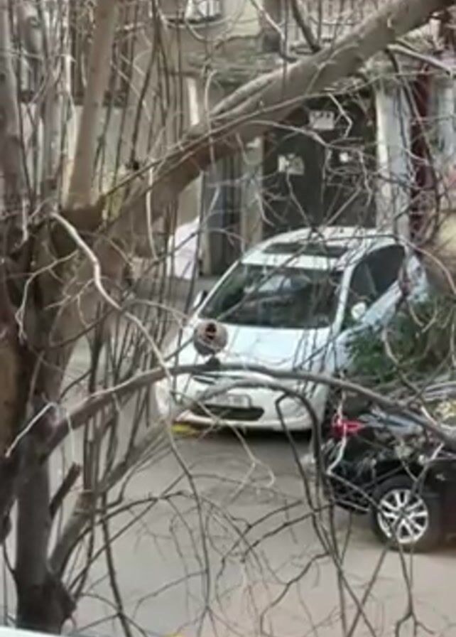 person walking out of a building behind a parked white car. The view is partially obscured by bare branches of a tree, and another black car is also parked nearby. The person appears to be wearing a jacket and hat. The setting appears to be an urban courtyard or parking area with surrounding buildings.
