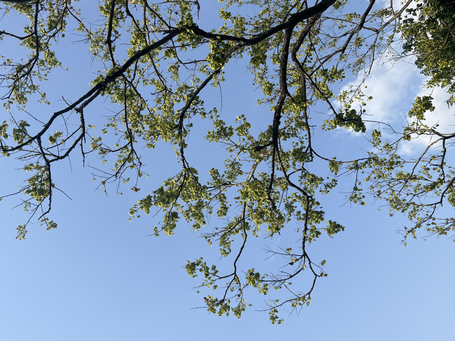 - "The scene presents an upward view through the canopy of a deciduous tree against a clear, bright blue sky with sparse white clouds visible in the lower right portion of the frame, located in Logba Adzakoe, Ghana" by FM-6dzJp2, licensed under CC BY 4.0