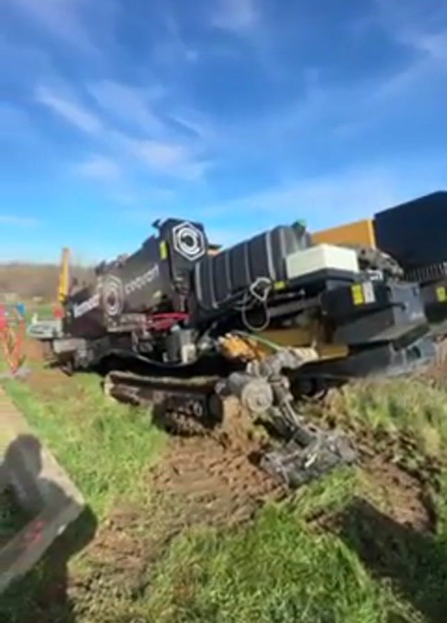 large black and yellow Vermeer Coquart horizontal directional drilling machine on a grassy verge next to an asphalt road