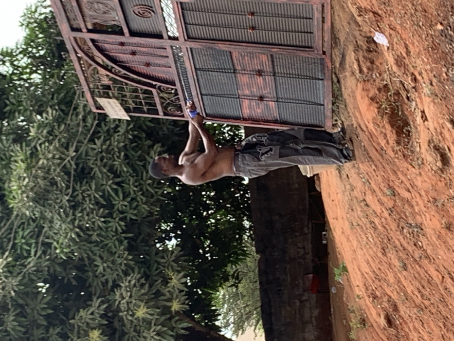 In Otuocha, Nigeria, an adult male stands outdoors, shirtless, wearing grey and black patterned trousers and sandals. He is positioned on an uneven, reddish-brown dirt slope. He holds a blue applicator with both hands, directing it towards a large, ornate metal gate section to his right. The gate is dark red/brown with black horizontal slats and elaborate scrollwork. A small white sign is attached to the upper left of the gate. Behind the man, a white bucket is visible on the ground. In the background, a low stone wall runs horizontally, with dense green trees and foliage beyond it. A piece of white litter is present on the dirt ground to the right foreground.