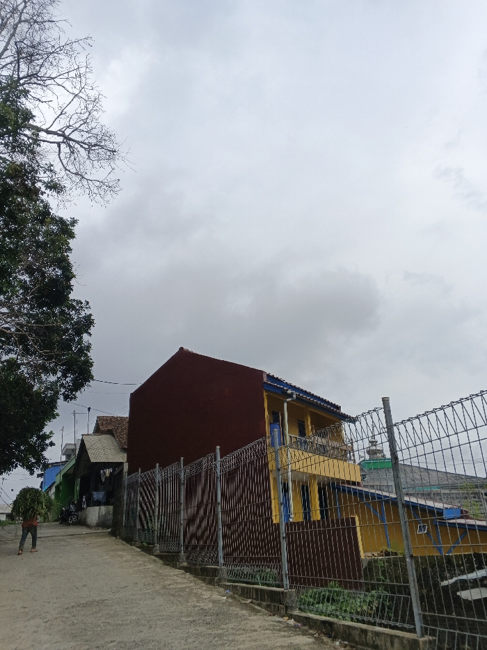 The image depicts a street scene in Kabiufa, Papua New Guinea, under an overcast sky. A paved pathway slopes upwards from the foreground, leading towards several buildings. On the left side of the path, a large tree with both dense green foliage and bare branches frames the upper-left quadrant. In the mid-ground, on the left side of the path, a single individual is observed walking away from the viewer. This person is carrying a large bundle of green foliage or grass balanced on their head/shoulder. They are wearing dark pants and a dark top, with visible footwear that appears to be sandals. Further up the path on the left, several structures are visible, including one with a dark brown gabled roof and another partially obscured blue building. A white motorcycle or scooter is parked near these structures. On the right side of the path, a metal mesh fence with vertical support posts runs parallel to the path. Behind this fence, a two-story building is prominent. Its side wall, facing the path, is a solid reddish-brown. The front facade, visible further back, is painted yellow with blue trim around its balcony and windows. A blue roofline is also visible. Beyond this building, a structure featuring a green dome, possibly a mosque or religious building, is partially discernible above and to the right. Small green plants are growing along the base of the fence on the right. Utility lines are faintly visible across the scene.
