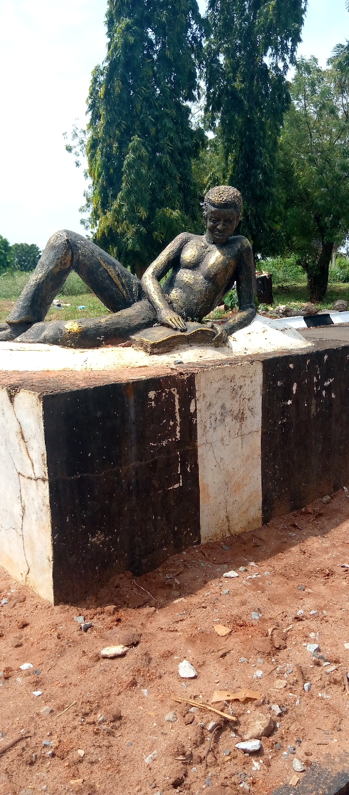 An outdoor scene in Nsugbe, Nigeria, depicts a dark-colored statue of a young, shirtless male figure reclining on a pedestal