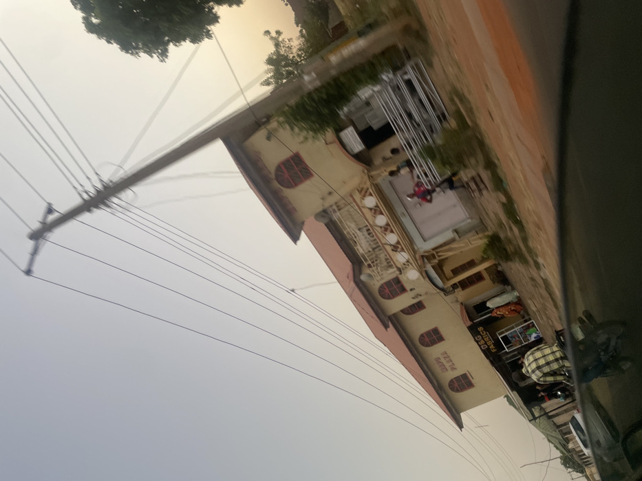A beige building with red-framed windows and a sign reading "DEEG PLAZA" and "DSG FABRICS" is pictured, likely from a moving vehicle. A utility pole and wires are visible against a light-colored sky. There are trees in the background and a metal structure on top of the building. People are on a platform above what appears to be the entrance.