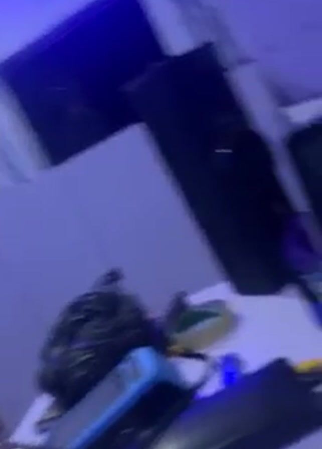 The video appears to be shot indoors, possibly in a workspace, illuminated by blue light
