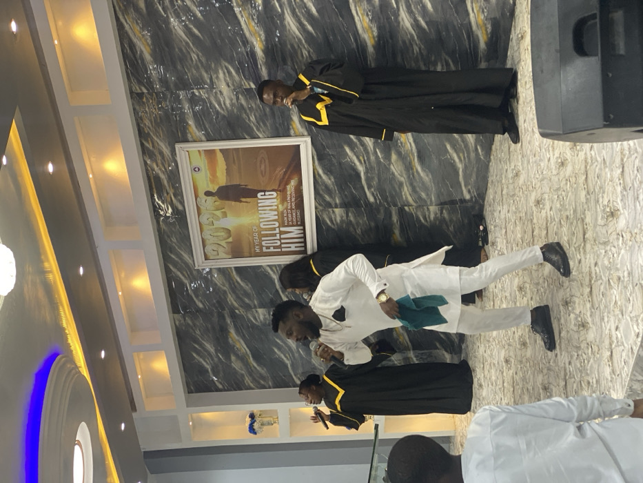 The image depicts an indoor event taking place in the city of Gbawe, Ghana. Four individuals, appearing to be performers or officiants, stand on a light-colored, patterned stage. In the center foreground, a Black male wears a white long-sleeved tunic with a black pocket square, white trousers, and black dress shoes. He holds a silver microphone to his mouth with his right hand and a folded dark green cloth in his left hand, appearing to sing or speak animatedly. A gold wristwatch is visible on his left wrist. To his immediate left, a Black female wears a black robe with yellow trim and holds a silver microphone to her mouth, appearing to sing with her eyes closed or uplifted. Partially obscured behind the central male is another Black female, also in a dark robe. To the far right, a Black male wears a black robe with yellow trim and holds a black microphone to his mouth. The background consists of a dark gray marble-patterned wall. Centered on this wall is a large, framed poster with the prominent text "2026" and "MY YEAR OF FOLLOWING HIM." Below, smaller text reads "MARK 10:28 A YEAR OF WALKING IN HIS GRACE, FAVOR, AND RECEIVING HIS BLESSING." The poster features a silhouette of a person walking towards a bright light on a path, against a sunset-like sky. A small white logo is present in the top right of the poster. The wall also features white recessed niches, one on the left containing a blue and white floral arrangement on a pedestal. The ceiling is multi-tiered with white and gold accents, featuring numerous recessed spotlights and strip lighting, including blue accent lighting in the top tier. In the bottom-left foreground, the back of a spectator's head, wearing a white shirt, is visible. A black speaker cabinet is partially visible in the bottom-right foreground.