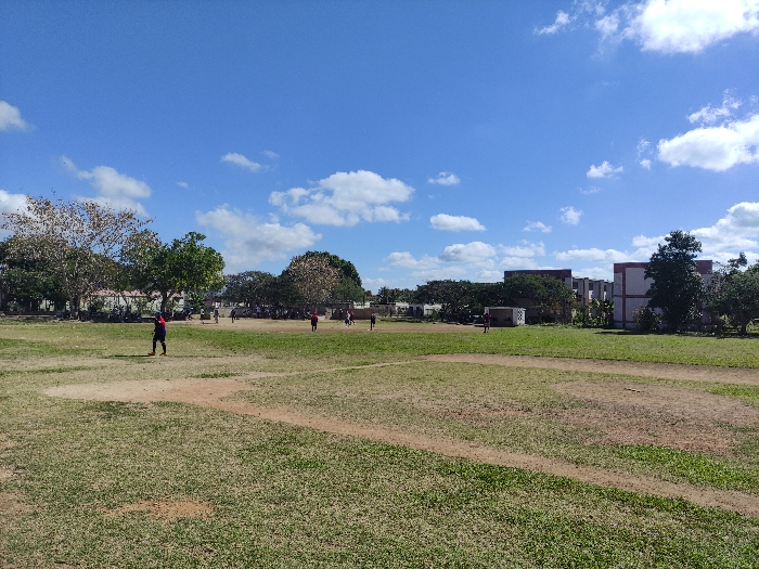 The scene depicts an outdoor sports field in Ciego de Ávila, Cuba, under a bright blue sky with scattered white cumulus clouds