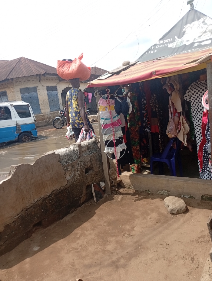 A street scene presents a small shop beneath a makeshift awning, clothes displayed on hangers. A man carrying a large orange bundle on his head and bags in hand walks past the shop. A dilapidated concrete wall defines the shop’s boundary. Across the street, a weathered building and a van are visible. A motorcycle is parked near the building. The ground is dirt.