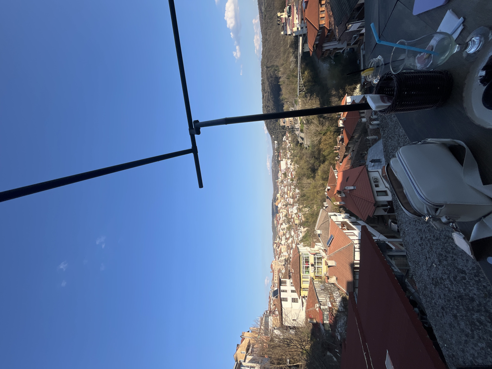 The image presents a high-angle view overlooking the urban landscape of Veliko Tarnovo, Bulgaria, under a clear blue sky with minimal cloud cover. A black metal structure, possibly part of a viewing platform or support frame, is prominently visible in the foreground, intersecting the sky. The cityscape extends across the frame, revealing a dense arrangement of buildings with predominantly red and white roofs. Structures vary in size and design, indicative of diverse architectural periods. Interspersed among the buildings are trees, suggesting both residential gardens and potentially parkland areas. On the right side of the image, a section of a table surface is visible, featuring remnants of a drink – an empty glass, a blue straw, and a small container. Adjacent is a partially visible white bag. The presence of these items suggests the vantage point is from a cafe or restaurant terrace. The scene conveys a sense of urban density framed within a scenic overlook.