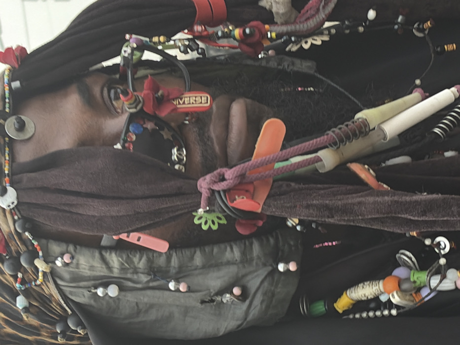 In the city of Ilado, Nigeria, a close-up forensic portrait captures an individual with dark skin, whose right eye is partially visible looking towards the upper right. A beard stubble is present around the mouth. The head is adorned with a layered ensemble consisting of a leopard-print fabric base, overlaid with dark brown and black cloth strips. These coverings are embellished with black and colorful beads, a white skull-shaped ornament, and a circular metal washer. Dark sunglasses cover the central facial area, featuring multi-colored rhinestones, star decals, a silver-toned 'CC' logo, a small red fabric flower-like adornment, and an orange tag with "UNIVERSE" printed in white. Numerous items are attached and draped around the subject's head, face, and chest: strands of beads (including pink, silver, black, white, orange, green), red and orange plastic clips, a green leaf-shaped charm, sections of purple rope, white and yellow cylindrical tubes, and metal springs. A section of crumpled light-grey fabric, also adorned with beads, is visible on the subject's left side. The background is indistinct and appears as a uniform light-colored blur.