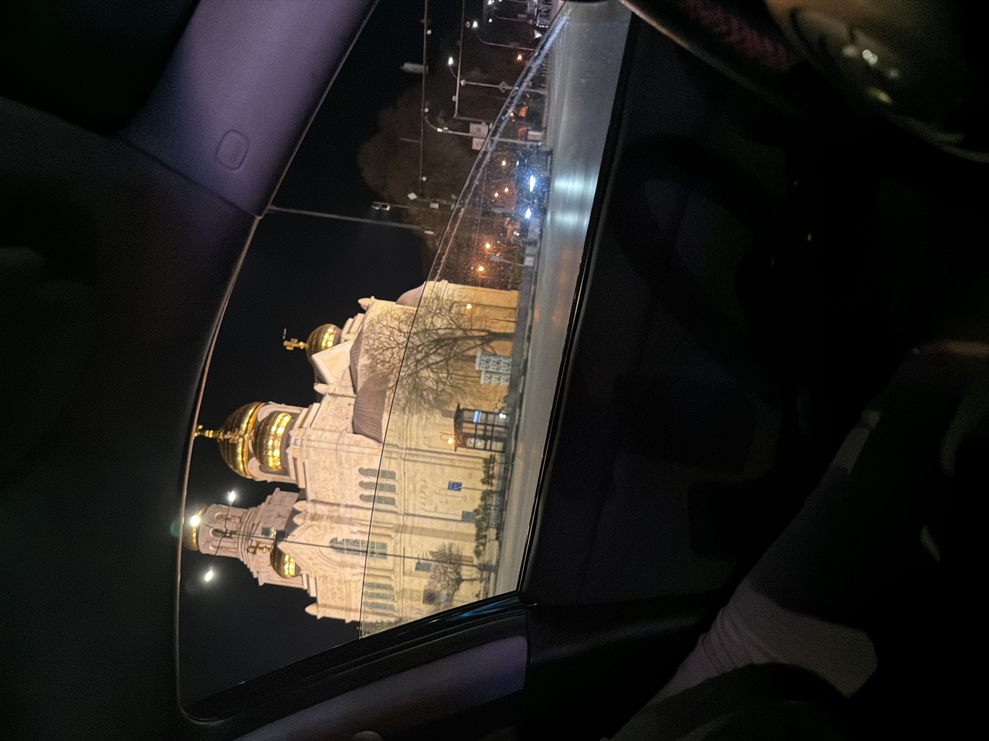 The image displays a night scene featuring the Dormition of the Theotokos Cathedral in Varna, Bulgaria, viewed from inside a vehicle. The primary subject is the large, light-colored stone cathedral, prominently illuminated against a dark sky. It features multiple golden onion domes and a tall bell tower, also topped with a golden dome and a cross. The cathedral's ornate facade is clearly visible. In the immediate foreground, the dark interior of the vehicle frames the scene. The left door's window frame and pillar are visible, partially obscuring the lower left portion of the cathedral. On the bottom left, a section of a person's lower leg and foot, wearing a light-colored sock, is visible within the car's interior. The upper right portion of the vehicle's interior, including the roof lining and an A-pillar with what appears to be an airbag indicator, is also visible. Outside the vehicle, a paved street or intersection is present, illuminated by streetlights. Several vehicles with active headlights are visible on the road, indicating traffic. A structure resembling a bus stop or shelter is located on the right side of the street, in front of the cathedral grounds. Bare trees are visible between the street and the cathedral, illuminated by the cathedral's lighting. The vehicle's window shows smudges and light reflections, particularly from the distant streetlights.