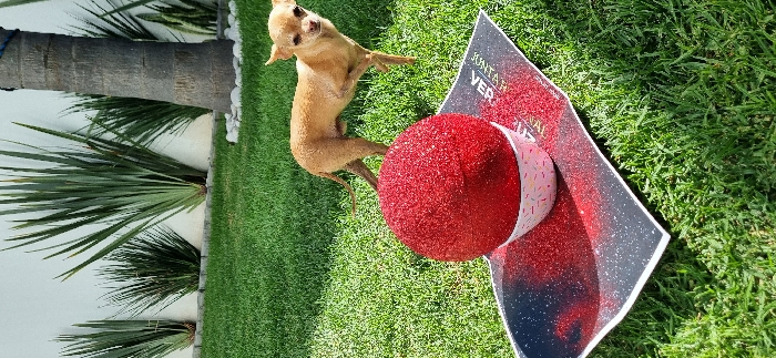 A chihuahua stands on green grass beside a 3D advertisement. The ad features a red glittery sphere partially extending out from a black and white background. Text is visible on the ad but illegible. A tree with large fronds is to the left of the chihuahua. The background includes a white wall.