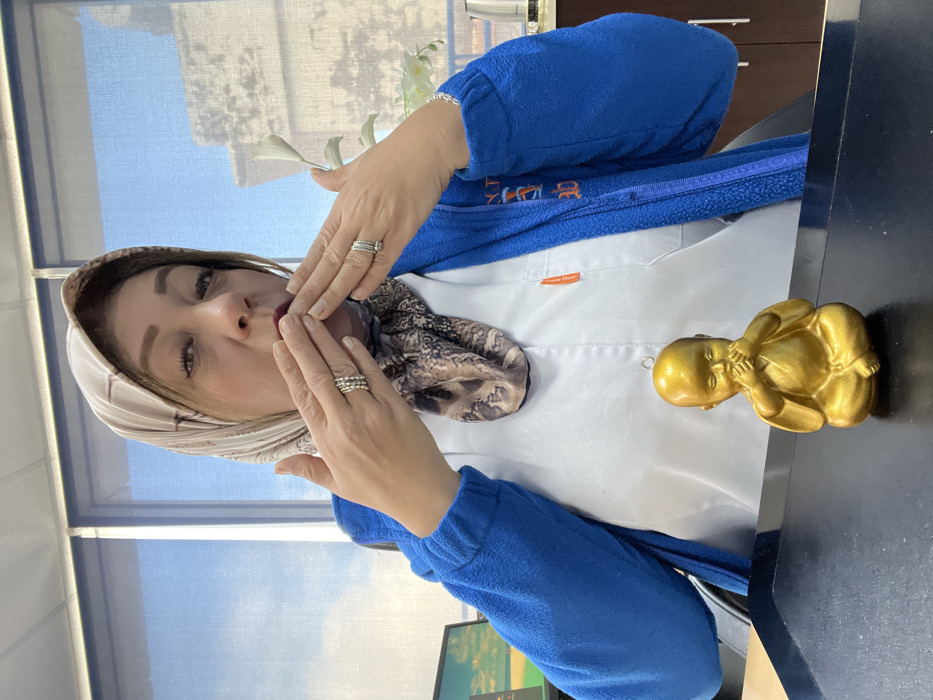 A female individual is centrally positioned, facing the camera, indoors. She wears a light-colored patterned headscarf, a dark patterned neck scarf, a white lab coat with an orange pen clipped to the chest area, and a blue fleece jacket. Her lips are painted dark red. Both hands are raised towards her mouth, with fingers joined, forming a gesture. She has multiple rings on her left ring finger and a single ring on her right ring finger. In the immediate foreground, on a black surface, a small, golden-colored figurine of a seated child-like figure, with hands covering its mouth, is visible. The background consists of large windows with vertical blinds, through which a blue sky and a light-colored building with multiple windows are discernible. A computer monitor is partially visible on the left, and indistinct objects are on a surface to the right. The specific location within the city of Meknes, Morocco, is not discernible from the image content.
