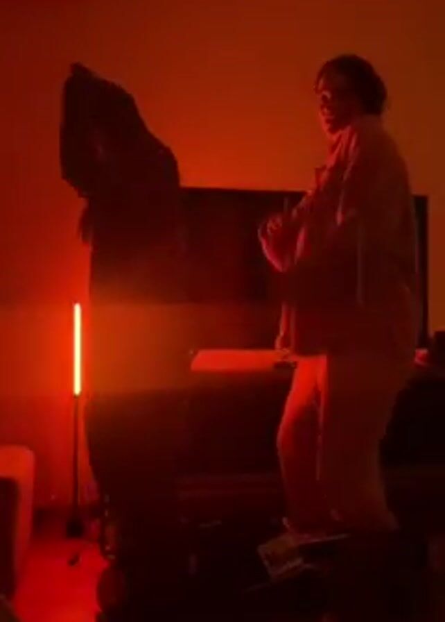 Two women are dancing in a room with dim lighting. One woman is wearing pajamas and the other is wearing a patterned outfit. There is a television in the background. The light in the room changes from red to yellow.