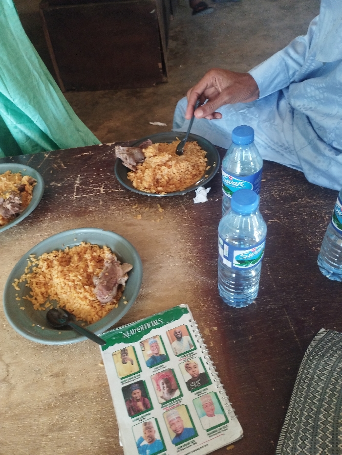 wooden table with four plates of food, two bottles of water, and a green booklet. The food is rice and meat. A person is sitting at the table, wearing a blue robe and holding a spoon, taking a bite of food. The person’s right leg is visible, and their left leg is off-screen. An open book with a green cover, titled "LEAD OFFICIALS", lies on the table. The book contains photos of people. The table is set in a room that appears to be a restaurant. The scene is captured from a slightly elevated angle. The location is Kaltungo, Nigeria (latitude: 9.816, longitude: 11.314).